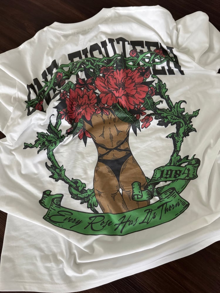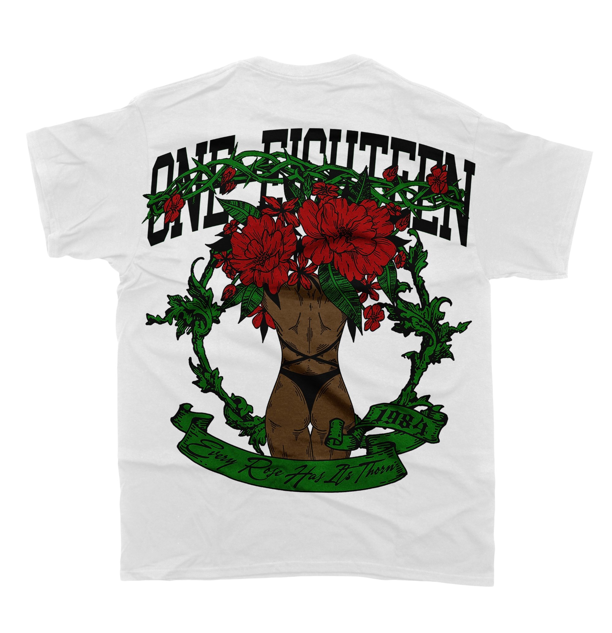 Back: Loud graphic featuring bold roses, tangled thorns, and fearless artwork framed with ONE EIGHTEEN across the shoulders. Banner reads “Every Rose Has Its Thorn” because beauty always comes with an edge.